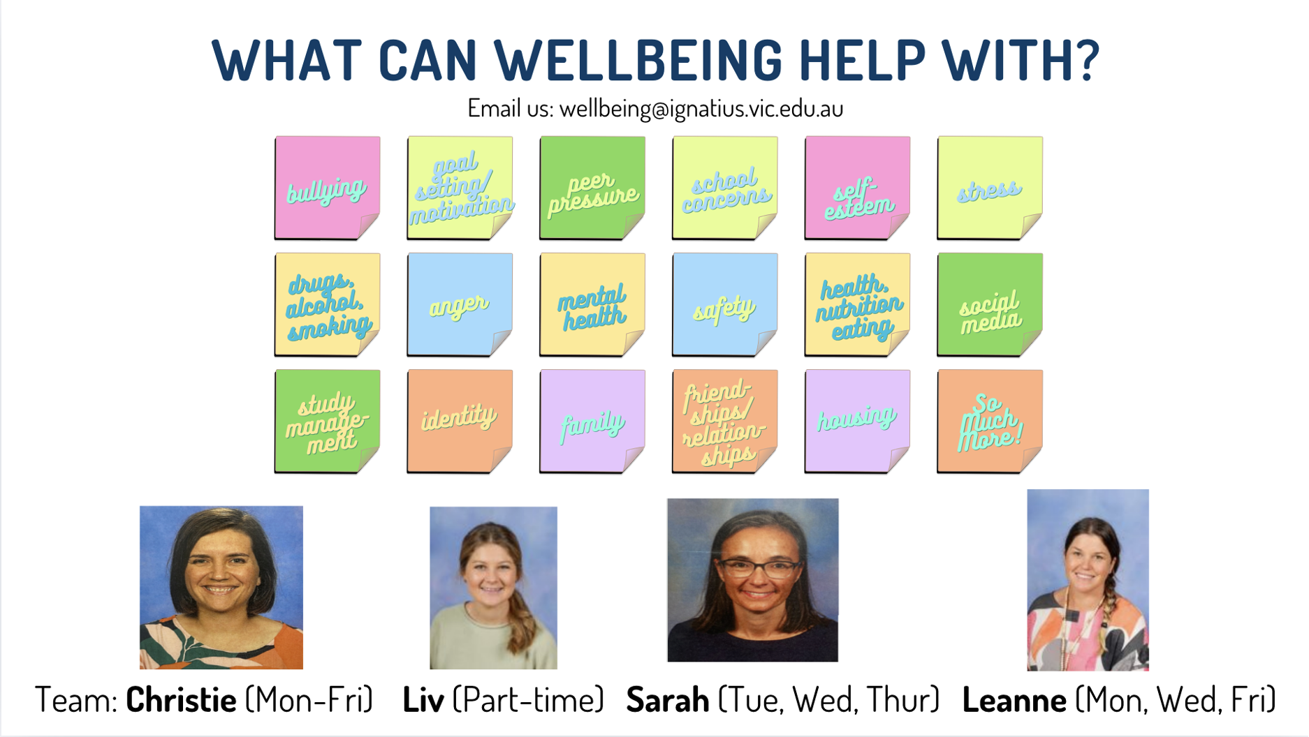 If you would like to contact the Wellbeing Team, please email wellbeing@ignatius.vic.edu.au or phone the school on 5251 1136, or contact your child's mentor teacher. A member of the team will get back to you to discuss next steps.