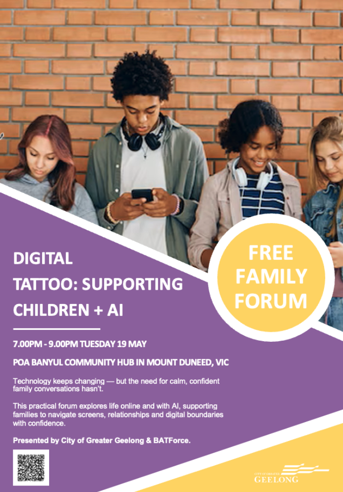 See the below details of a free Family Forum focusing on youth online safety and AI, aiming to help parents/guardians navigate digital technology, build healthy relationships, and manage AI, social media and gaming.
