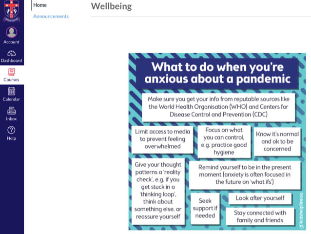 Our Wellbeing team have regularly been updating the Wellbeing CANVAS page to ensure students and their families have up to date information and support. There are some great resources and links on there for students, staff and parents including specific information on COVID-19 and navigating this complex time.