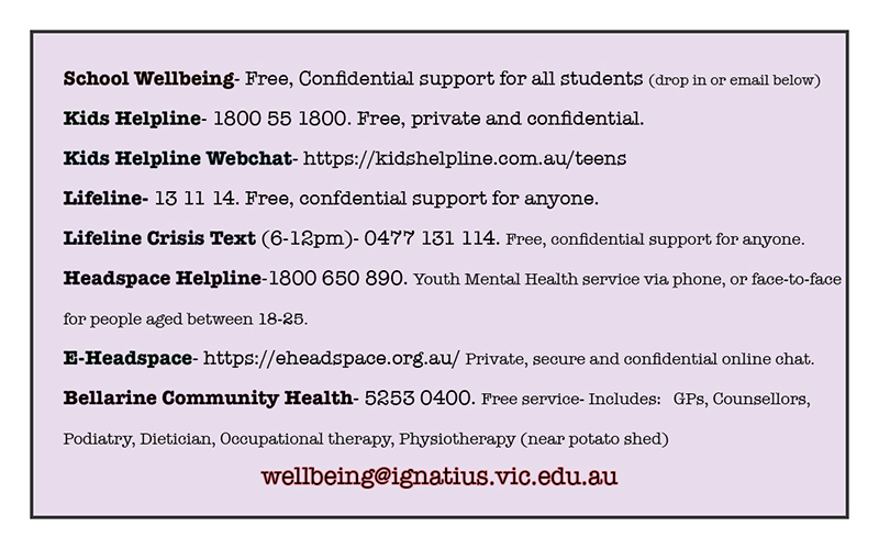 Please know that help is still available – although the wellbeing team will not be available after the 18/12/2020 there are still many supports available online and in our community over the summer for students and families so make sure you reach out if you feel the need, or if you are worried about someone else.