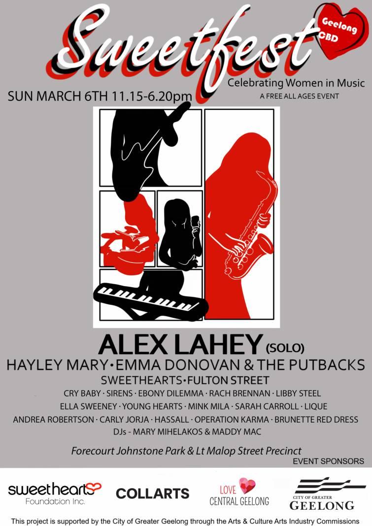 On Behalf of Sweethearts, I wanted to let you know about a free all ages music festival, Sweetfest, we are putting on Sunday March 6th in Geelong CBD. It would be great if you could share this around your community.