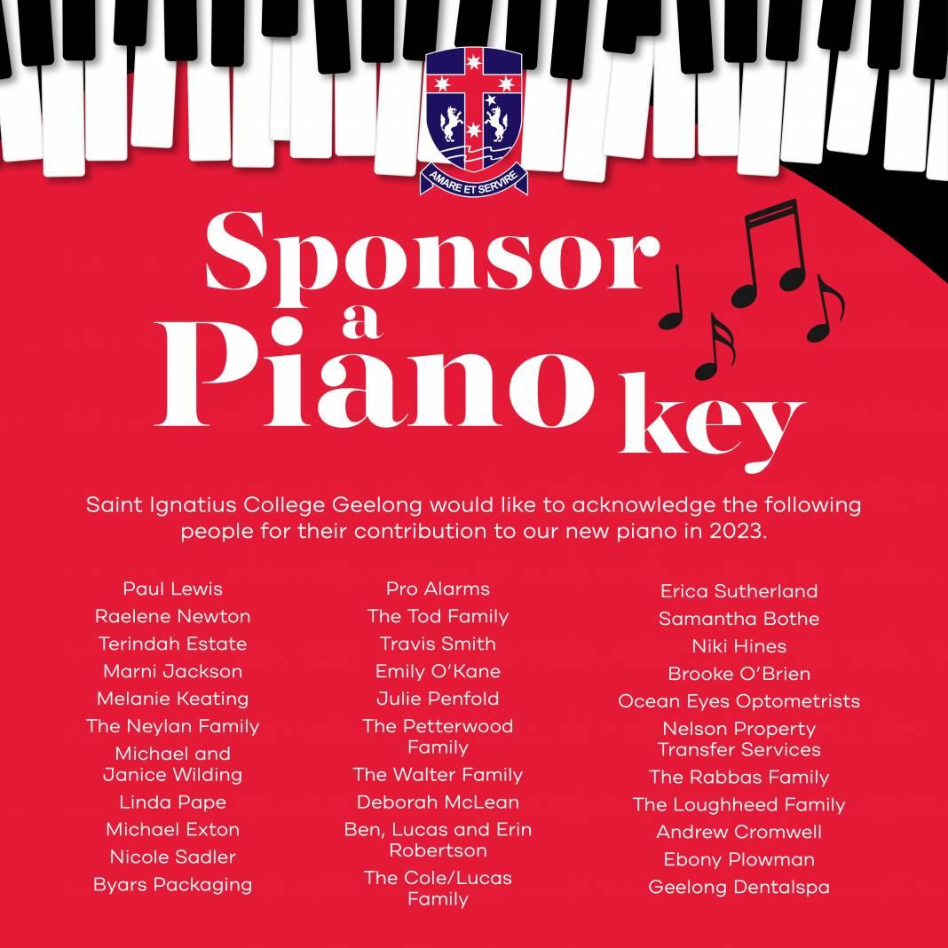 As the Performing Arts Department excitedly conduct research for their new piano, Saint Ignatius College Geelong would like to thank the following people, and businesses for their contribution to the 'Sponsor a Piano Key' initiative.