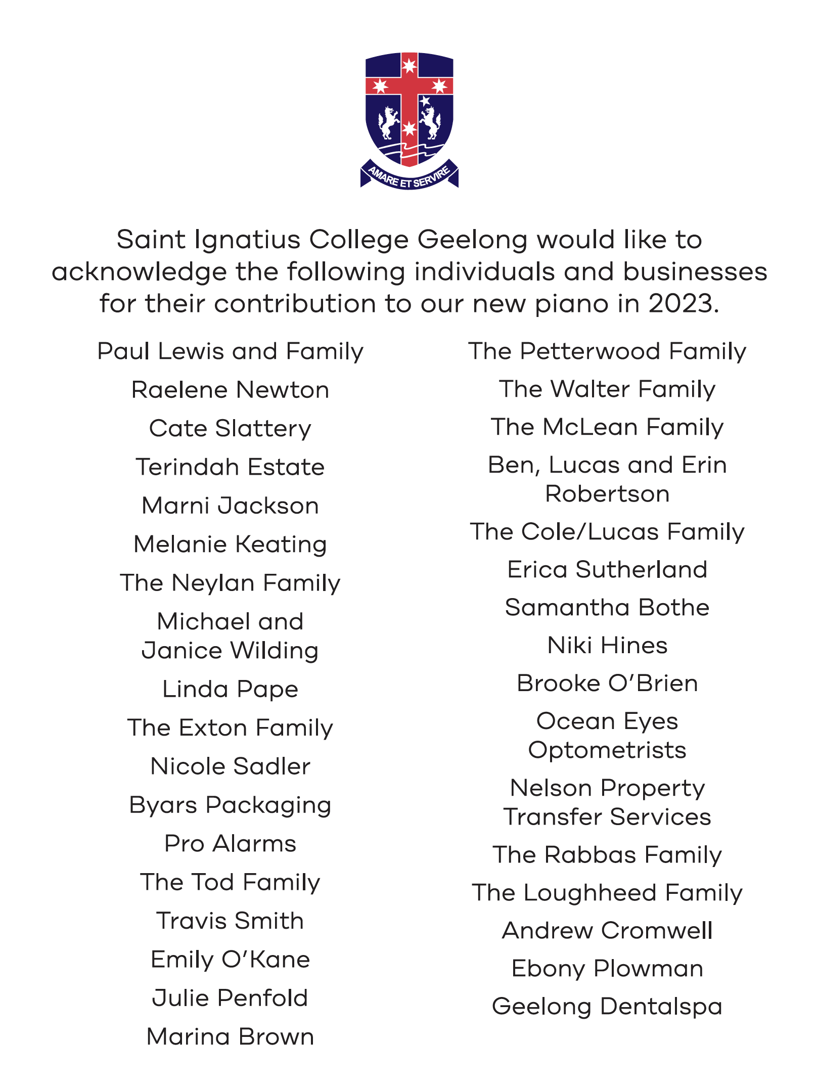 As the Performing Arts Department excitedly conduct research for their new piano, Saint Ignatius College Geelong would like to thank the following people, and businesses for their contribution to the 'Sponsor a Piano Key' initiative.