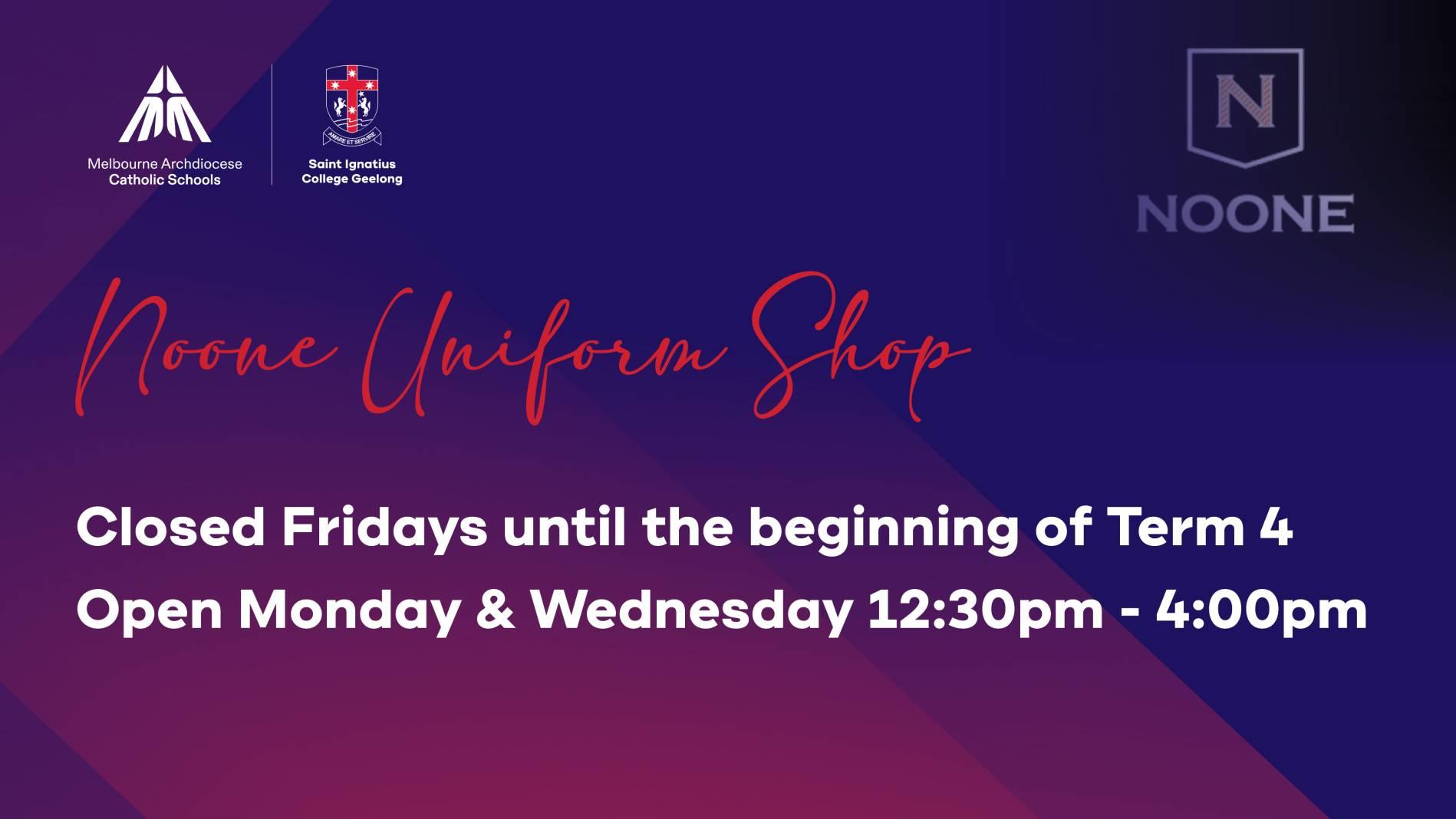 Noone Uniform Shop will be closed Fridays until the beginning of Term 4.