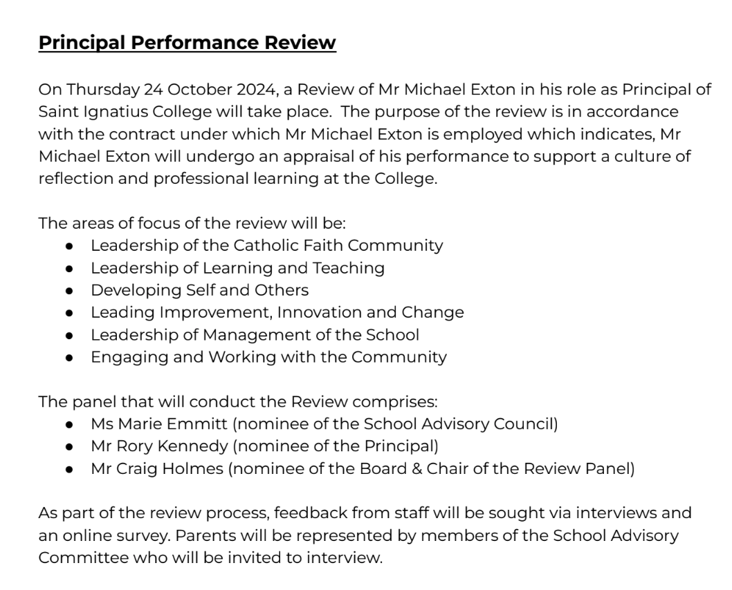 This term, Melbourne Archdiocese Catholic Schools (MACS) will conduct the process for my mid-term contract review. The review will involve me completing a self-reflection on the last three years, a survey of all staff, interviews of many staff, students and parents and the completion of a report for MACS. The process will be completed by the end of this term.