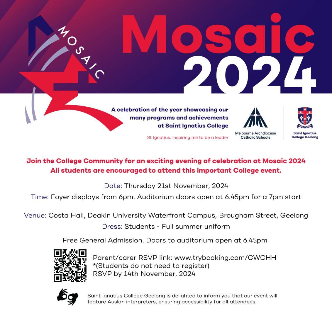 Our annual ‘Mosaic’ evening is a wonderful celebration of our College community. All members of our school community are encouraged to attend this fantastic evening on Thursday, 21st November, at Costa Hall, Deakin Waterfront Campus (Brougham Street, Geelong). Attendance is required for all Year 7 and 8 students, and we encourage as many Years 9 to 12 students as possible to join us.