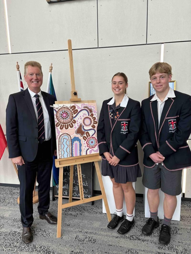 On Thursday, the whole school gathered for the annual Farewell to Year 12 assembly. We celebrated the achievements of our students and teams since our last assembly and recognised the fine young women and men of the Class of 2025. Highlights included speeches, musical items, and presentations. College Captains Bel Gee and Tucker Kooloos delivered memorable speeches reflecting on the Year 12 journey, expressing gratitude, and encouraging all students to embrace opportunities during their school years. The College Captains and Vice-Captains, Stephanie Reynolds and Riley Molloy, presented a gift of Indigenous artwork from the Year 12 students to the school community (see accompanying image). Year 7 students Nemiah Gillies & Sophie Hopper delivered heartfelt messages to our Year 12s, demonstrating confidence and thoughtfulness in their speeches.