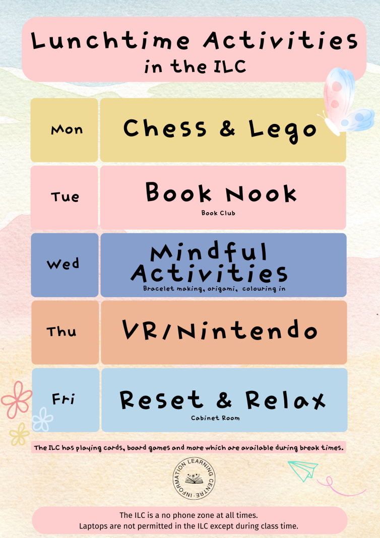 The ILC has continued to provide scheduled lunchtime activities each day of the week, throughout Term 4. Like-minded students have gathered in the ILC and participated in the various activities offered.